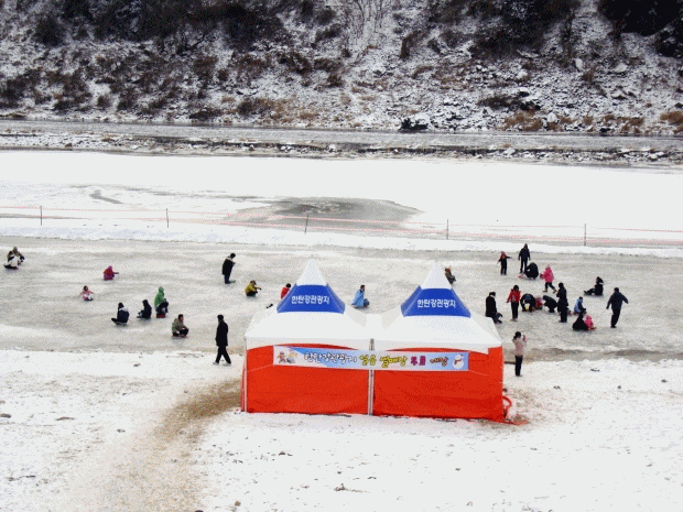 한탄강에 추억의 썰매장이 무료로 운영되고 있습니다.